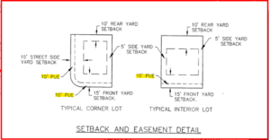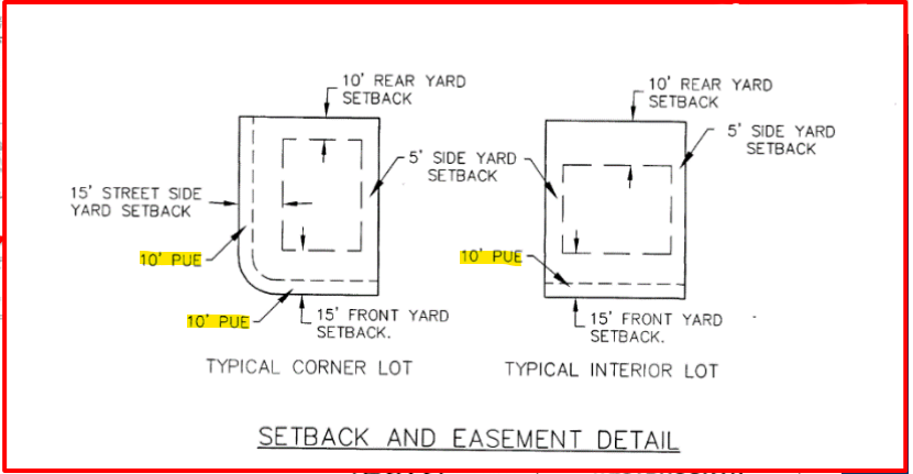 The land developer and the municipality that created the building lot allow certain areas of private property to be used for installing and maintaining public utilities or drainage. These are called Public Utility Easements (PUE) and are shown (usually as dotted lines) on subdivision plats.
