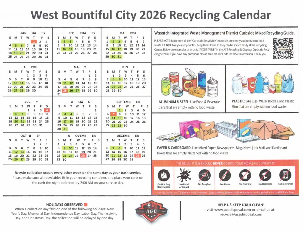 PROOF OF WEST BOUNTIFUL RESIDENCY WILL BE REQUIRED * Please take Hazardous Waste to Wasatch Energy Recovery Facility in Layton. ** Please take Green Waste to Bountiful Landfill. It is accepted there year round–but the city will cover the cost during our clean-up period. |